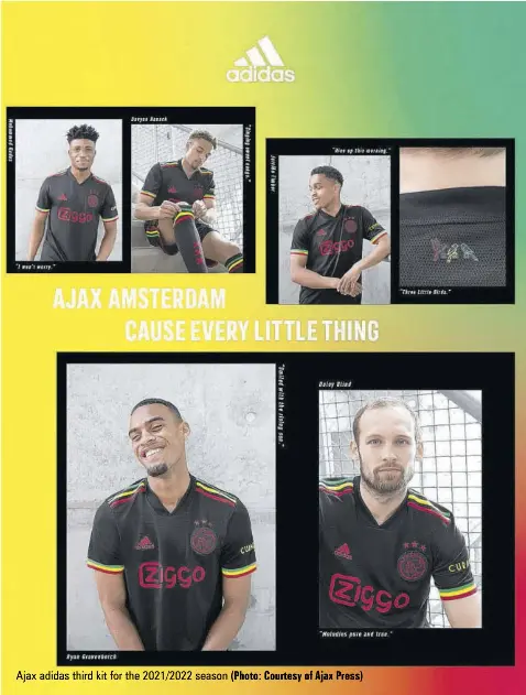The kit is a tribute to ajax's fans and the love shared by the club and its fans for reggae legend bob marley and his iconic song, three little birds.